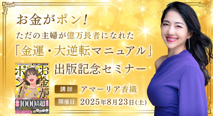 アマーリア香織さんの新刊『お金がポン! ただの主婦が億万長者になれた「金運・大逆転マニュアル」』の出版を記念し、スペシャルセミナーを開催します。