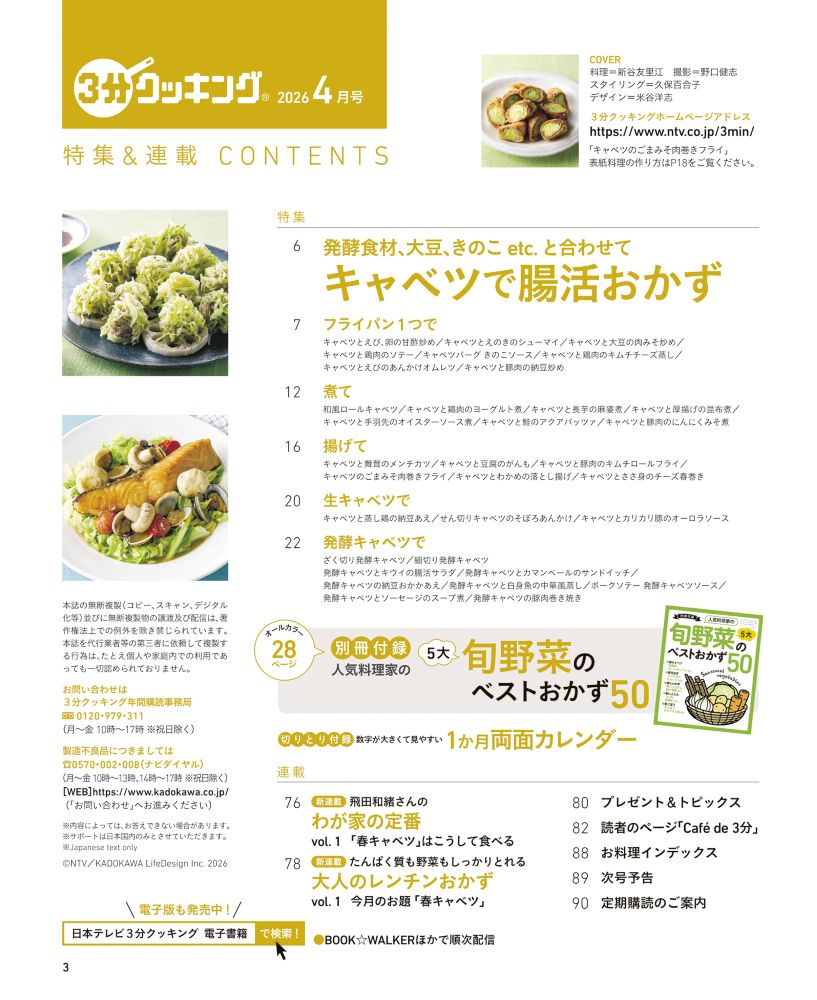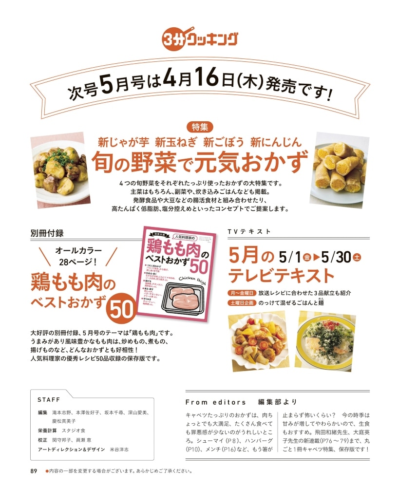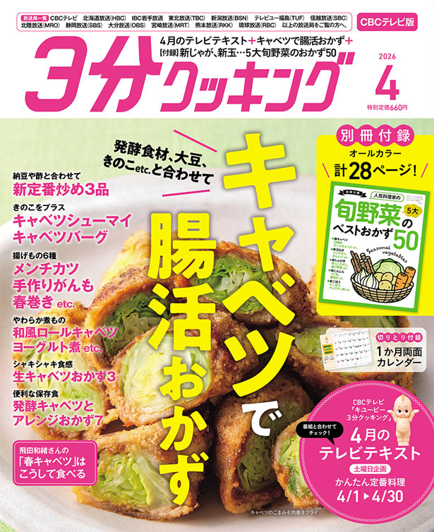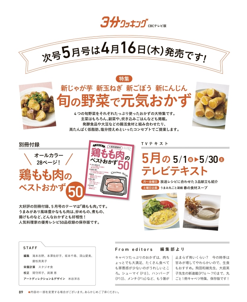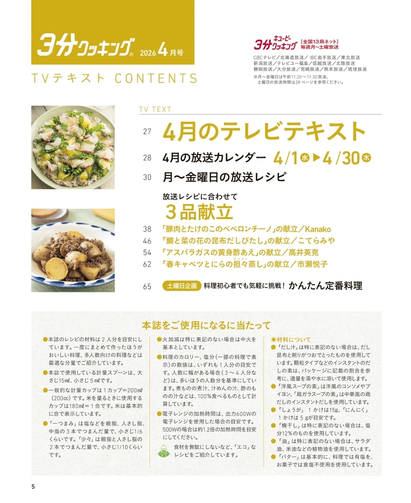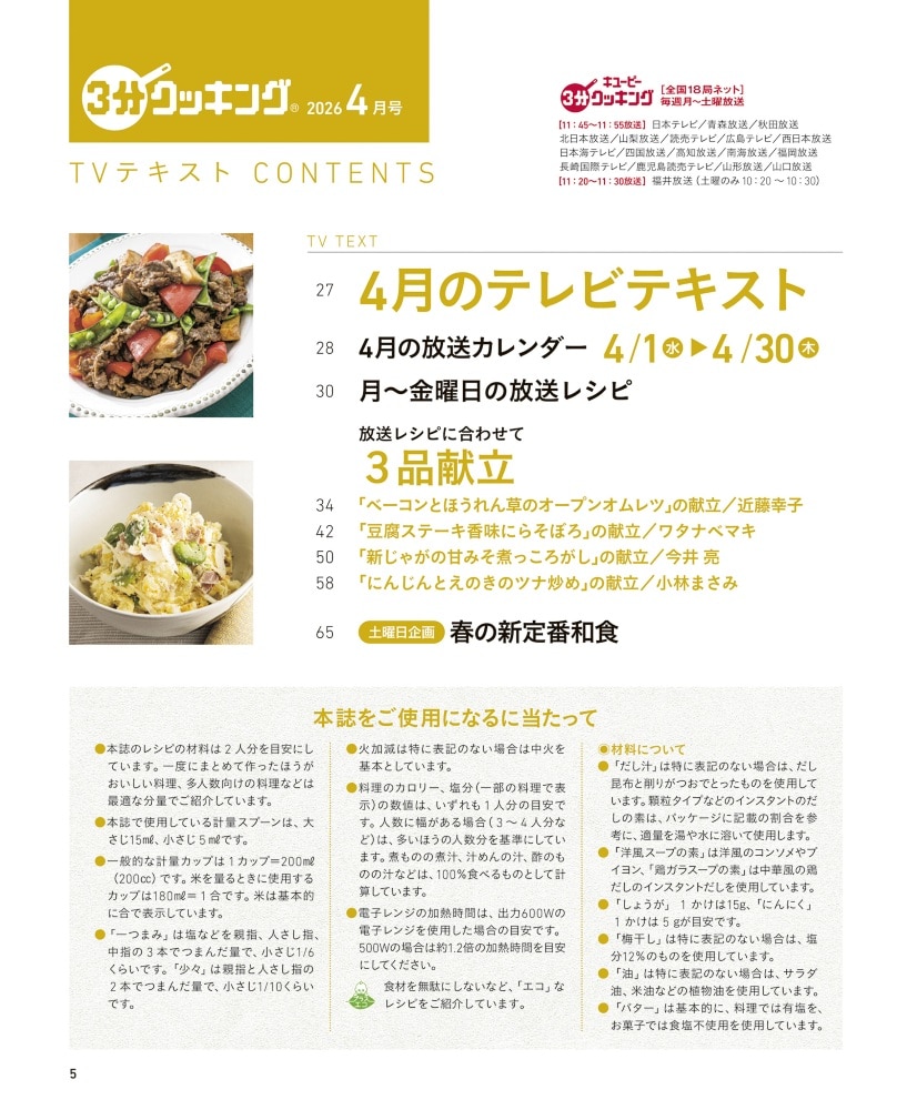 日本テレビ系列「キユーピー3分クッキング」の放送テキストが掲載されています。下記の放送地域をご確認の上、ご購入ください。