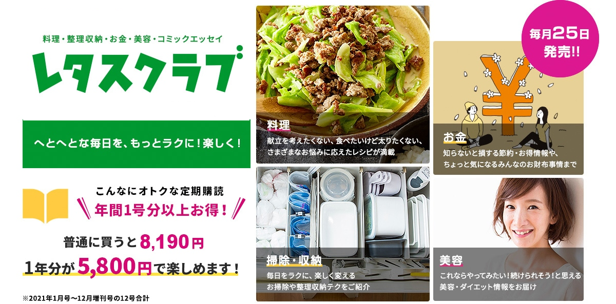 毎号ついてくるオトクな付録や、見逃せない大好評連載も充実のレタスクラブはバックナンバーも各号取り揃えています!