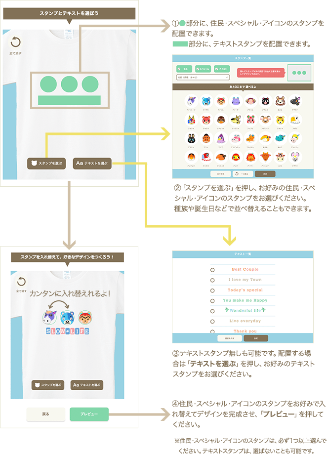 あなたのすきな住民のスタンプをつかってオリジナルグッズを作ってみましょう。
