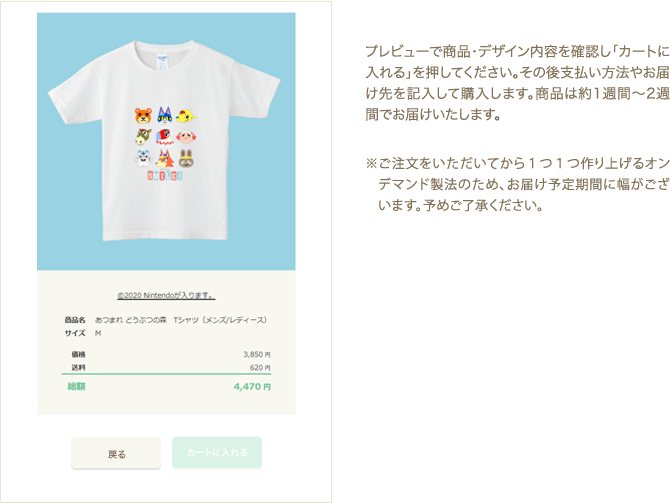 「あつまれ どうぶつの森 マイグッズコレクション」は『どうぶつの森』に登場する住民たちのイラストを自由に組み合わせ、あなた好みのグッズを作って注文できるストア。